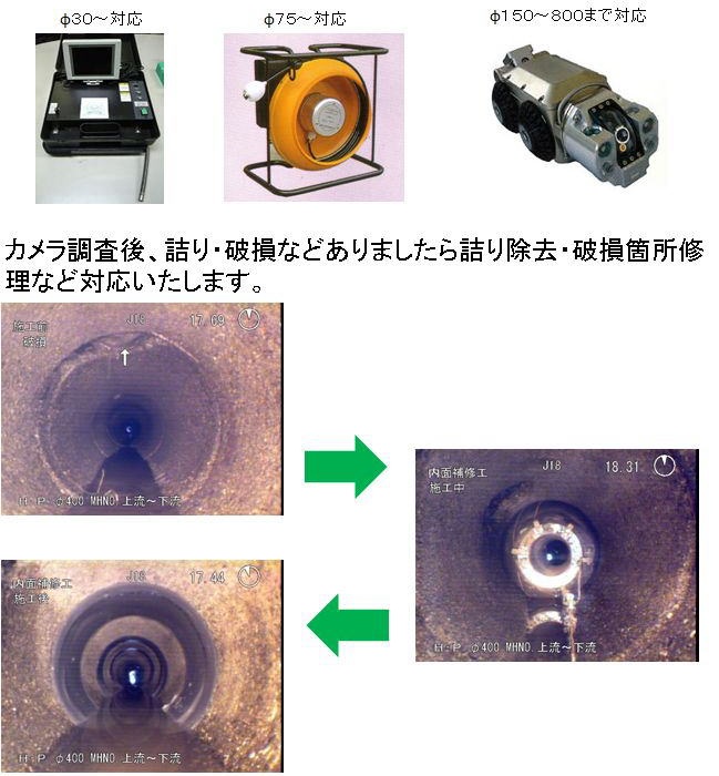 下水道本管や取付管、工場内・宅内の排水管、用水暗渠等幅広く調査いたします。